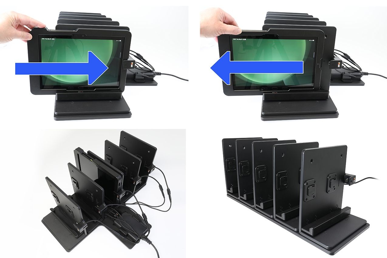 Deze tafelstandaard wordt geleverd met vijf ModTek-bevestigingen, speciaal ontworpen voor de ModTek Case. Perfect voor het ordenen, opladen en opbergen van meerdere tablets op één oppervlak. De tafelstandaard is voorzien van een krachtige 5-poorts multi-lader met ondersteuning voor een uitgangsvermogen tot 300 W, waarbij elke USB-C-poort tot 60 W ondersteunt.