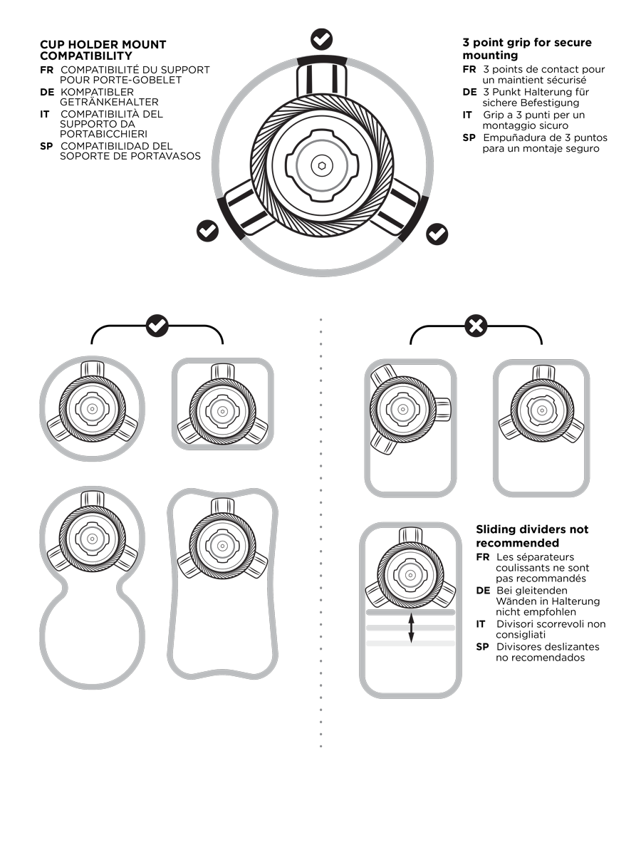 De bekerhouderbevestiging moet aan drie zijden stevig in de bekerhouder vastzitten voor een goede stabiliteit. Zorg ervoor dat de montageplek vrij is van obstakels zoals schuifdeksels of scharnierende deksels.