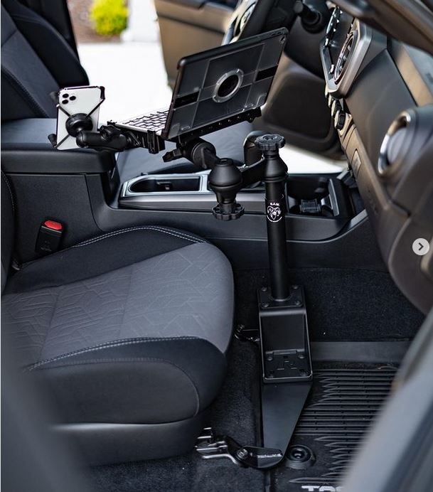 Neem deze solide en flexibel instelbare laptop swingarm set met X-Grip voor smartphone. Bevestiging mogelijk in alle auto's en bestelbussen waar de stoelbouten van de bijrijdersstoel bereikbaar zijn (stoelrails). Gebruikt dezelfde bouten voor bevestiging van de stalen basis waarom de complete standaard rust.