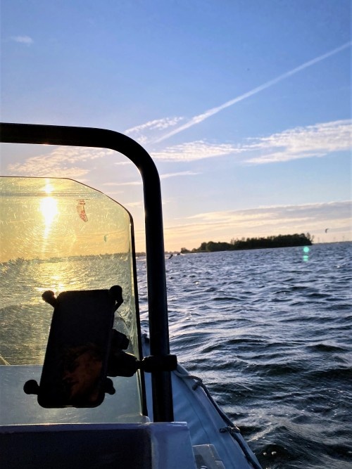 Deze RAM Mounts X-Grip is gemonteerd op de console van een Joker ribboot. Gebruiksklaar voor om tijdens het varen op een verantwoorde manier de telefoon te gebruiken.