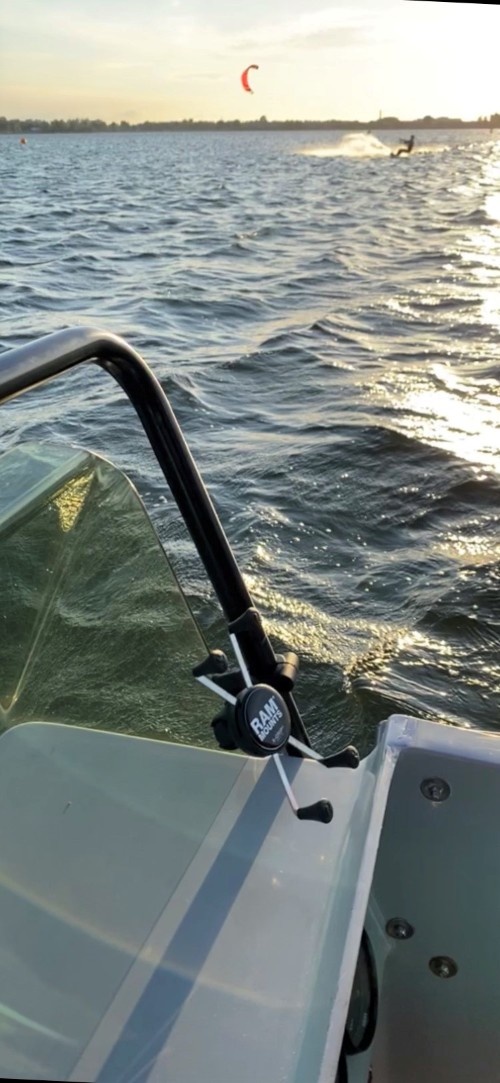 Voor de telefoon gebruikte hij een grote RAM Mounts X-grip voor smartphone, klem vast gezet op de railing rondom de console met een stevige torque montage mount. Door de stevige bevestigingsmethode is er nauwelijks last van schokkende bewegingen tijdens het gebruiken van de smartphone.