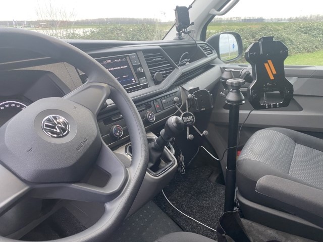 In onze eigen VW Transporter T6.1 hebben we een Samsung Active Pro tablet gemonteerd op een RAM Mounts Swingarm met vehicle base plaat gemonteerd aan de stoelbouten van de bijrijderstoel. De Active Pro is voorzien van beschermende case en kan gedockt worden op een HAVIS dock. Met simpel inklikken zit de tablet muurvast (en eventueel op slot) en wordt deze direct opgeladen.