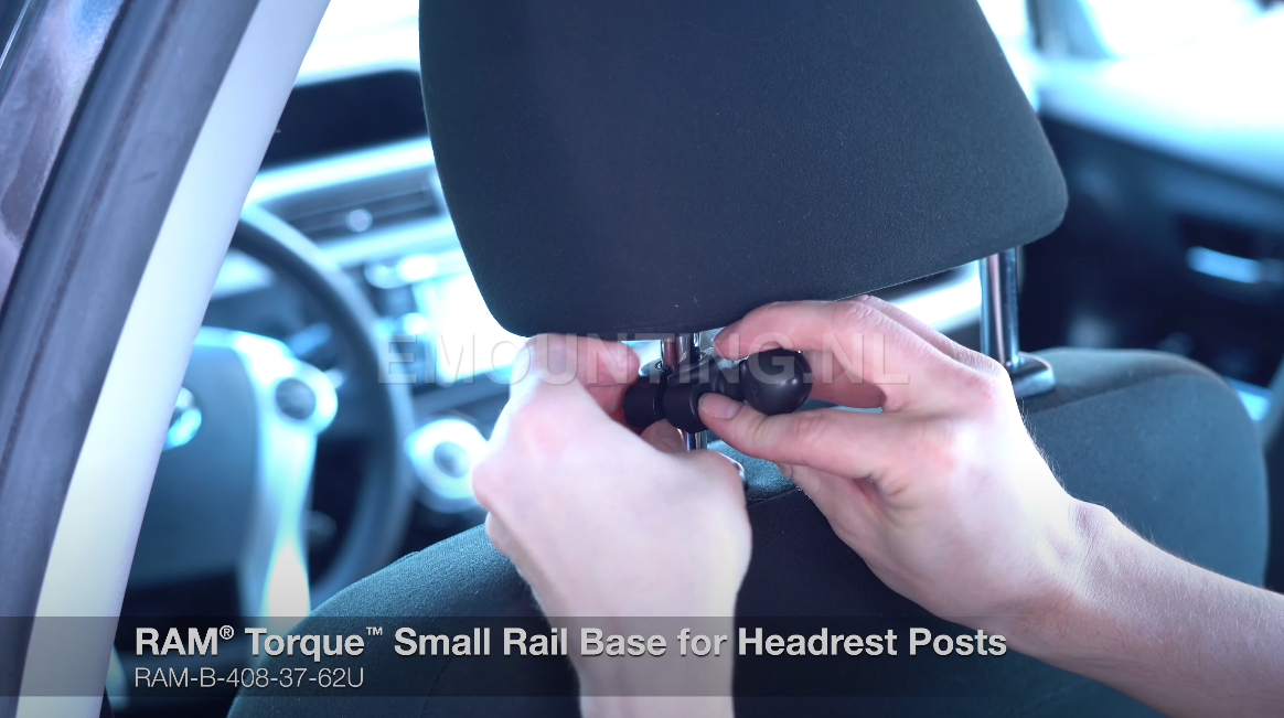Een andere goede oplossing voor het monteren van een tablet op de achterbank is de Torque mount. Deze kan worden bevestigd aan de hoofdsteun van de voorstoel.
