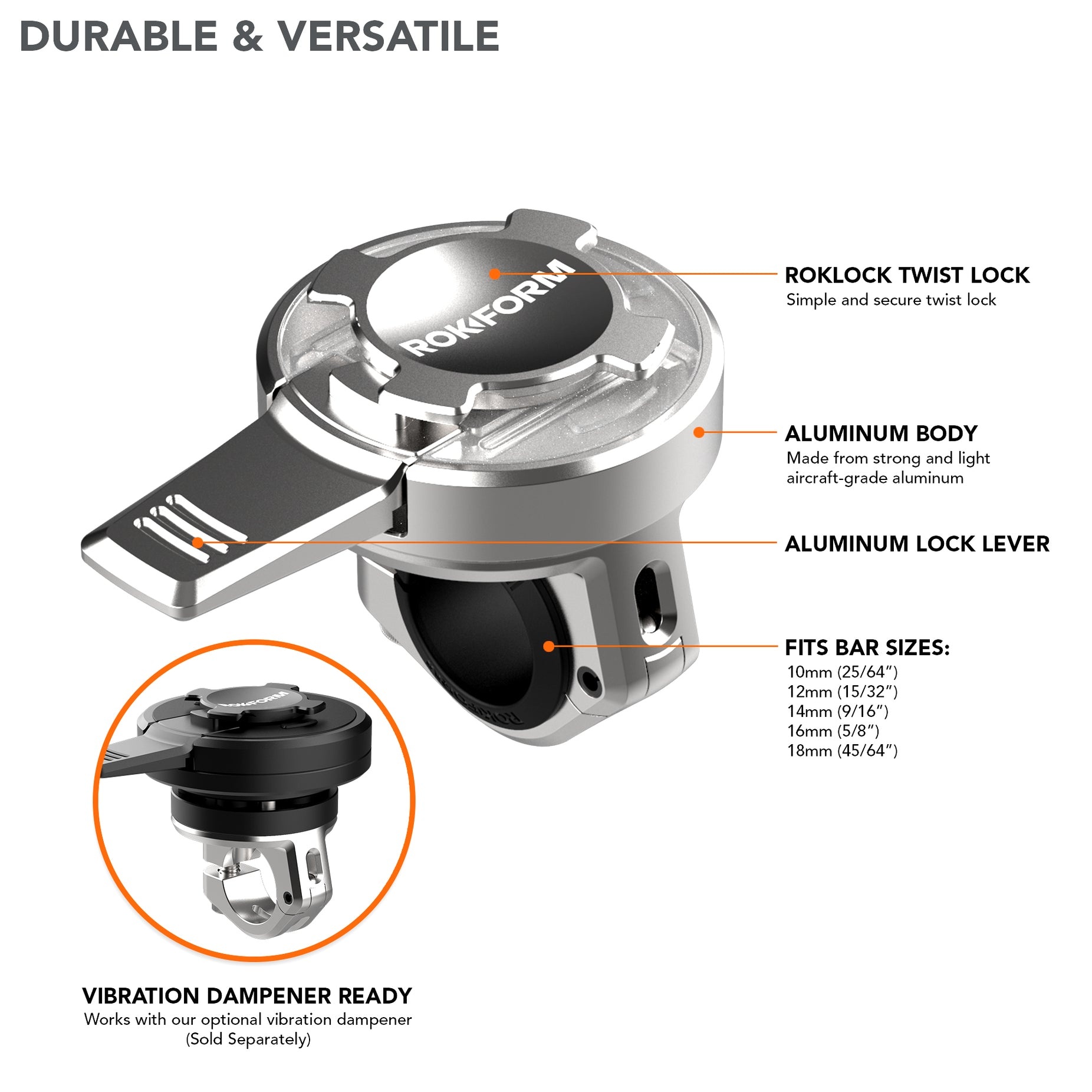 De spiegelstang bevestiging van Rokform houdt uw smartphone veilig vast en past universeel. We maken onze mount van stevig aluminium van vliegtuigkwaliteit om ervoor te zorgen dat hij geschikt is voor de ontberingen van ruig reizen. Onze houder ziet er stijlvol uit, maar biedt ook maximale veiligheid..