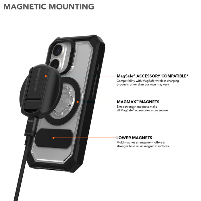 COMPATIBEL VOOR DRAADLOOS OPLADEN*: Ontworpen om te werken met ROKFORM magnetische oplaadproducten (*Compatibiliteit met MagSafe® draadloze oplaadproducten buiten ROKFORM kan variëren).