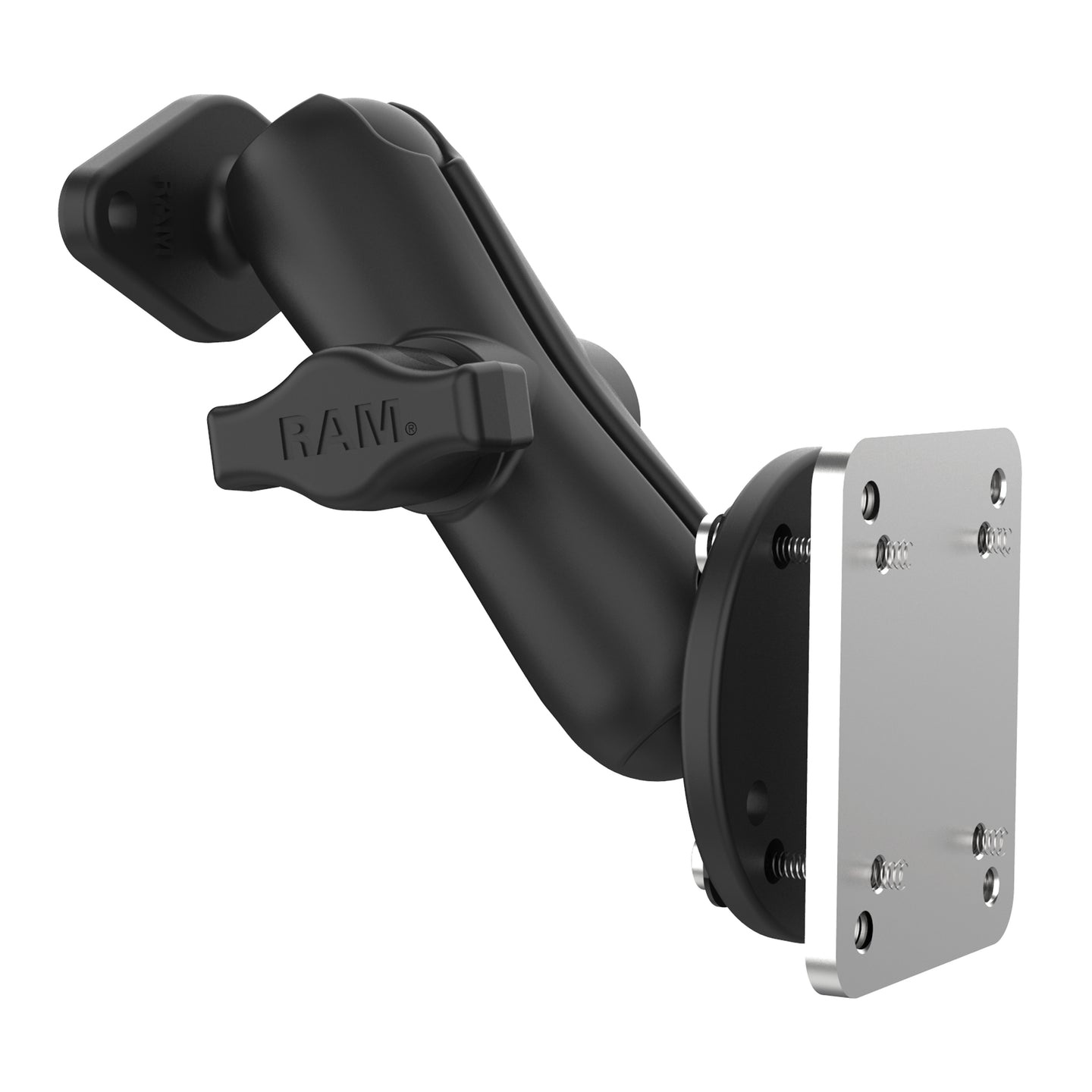 De RAM® Double Ball Mount met achterplaat en diamantplaat (RAM-B-138U-225B2) bestaat uit een arm met dubbele kogelgewricht, een ronde basis met een diameter van 6,3 cm, een diamantbasis van 6,1 cm x 3,3 cm, een achterplaat van 5,4 cm x 6,6 cm en bevestigingsmateriaal. Elke basis is voorzien van het universele AMPS-gatenpatroon, waardoor ze compatibel zijn met alle RAM®-apparaathouders. De houder is ontworpen met een rubberen kogelgewrichtsysteem met een diameter van 2,5 cm en verstelpunten aan beide uiteinden van de arm met dubbele kogelgewricht, wat zorgt voor vrijwel oneindige verstelbaarheid voor ideale kijkhoeken.