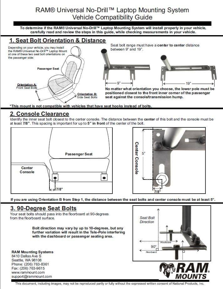 De RAM No-Drill Universele Laptopmontage (RAM-VB-196-SW3) wordt snel en eenvoudig op de passagiersstoelrails geïnstalleerd met behulp van de bestaande voertuighardware. Deze laptopmontageset is telescopisch, waardoor gebruikers de hoogte kunnen aanpassen van 30,48 cm tot 45,72 cm. Dubbele zwenkarmen zorgen voor articulatie en 30,48 cm bereik voor toegang van passagier en bestuurder tot het gemonteerde apparaat. RAM® rubber kogel en arm technologie biedt extra instelbaarheid, evenals schok- en trillingsisolatie. De veergeladen RAM® Tough-Tray™ III laptop houder biedt plaats aan laptops van 25,4 cm tot 43,18 cm (diagonaal gemeten).