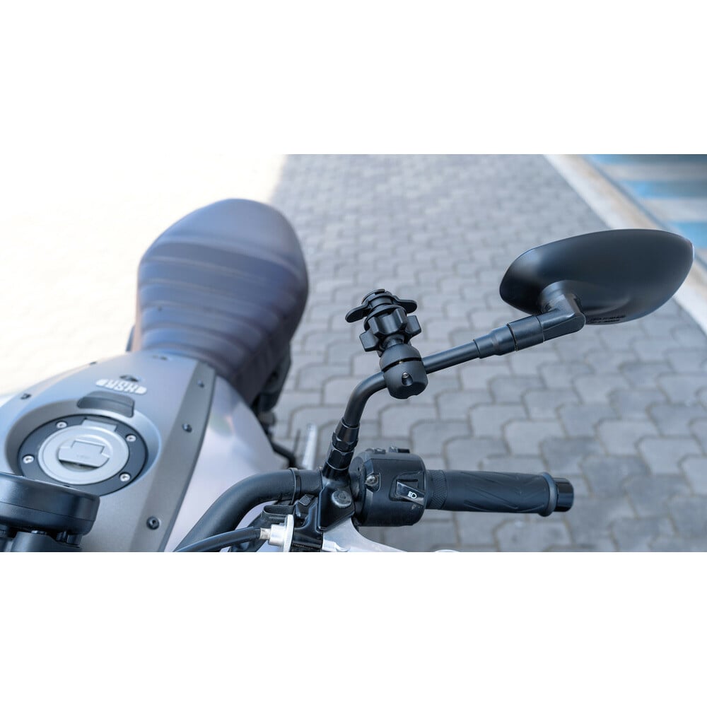 Spiegelbevestiging voor scooters en motoren (maar ook handig op rolstoel of scootmobiel) uitgerust met DUO LOCK connector voor montage van Opti-cases en accessoires. Past ook perfect op windscherm stangetjes van een scooter.