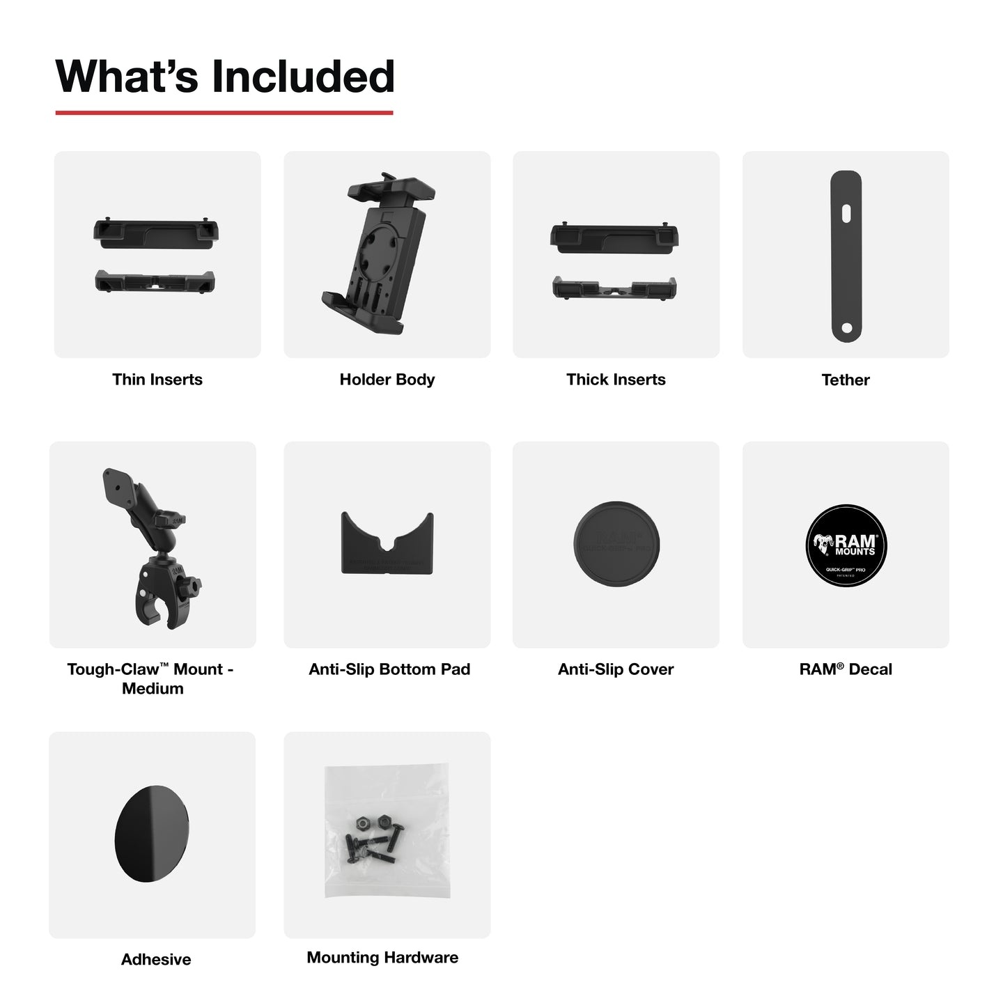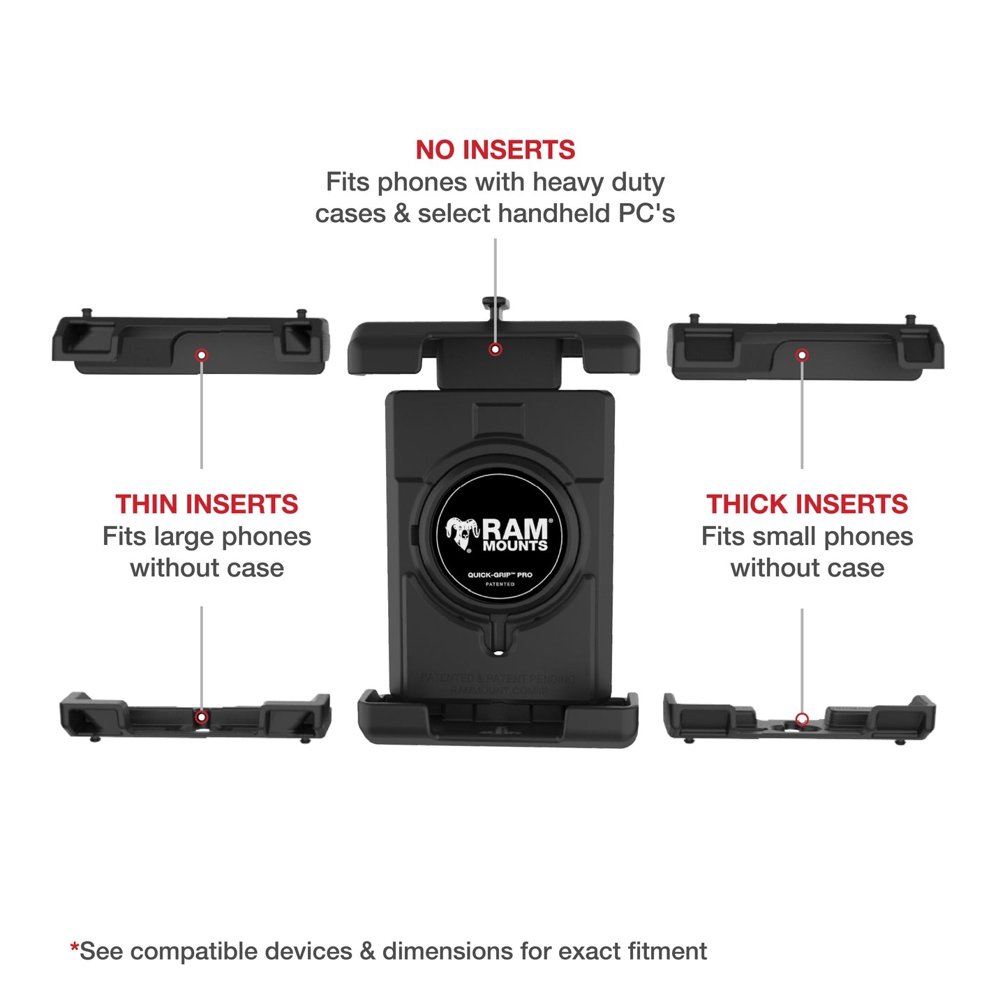 De RAM® Quick-Grip™ Pro XL telefoonhouder met kleine Tough-Claw™ basis - Medium (RAM-B-400-PD7U) is een set die snel op rails kan worden bevestigd en de volgende evolutie in de RAM® Quick-Grip™ telefoonhouderserie vertegenwoordigt.