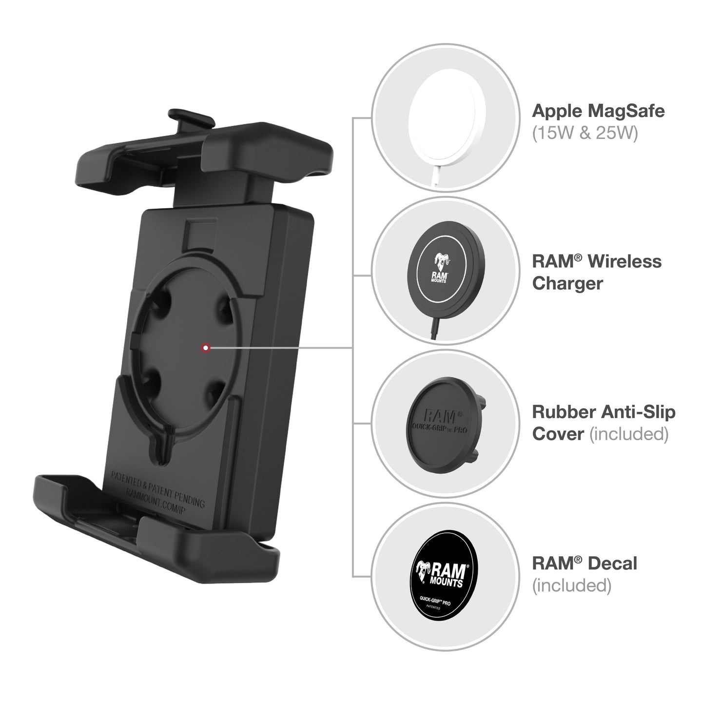 Deze is opnieuw ontworpen als de meest robuuste universele telefoonhouder die geschikt is voor een breed scala aan telefoons en handheld apparaten. Hij beschikt over een geïntegreerde uitsparing die compatibel is met de RAM® Qi2 draadloze oplader of de Apple MagSafe puck, waardoor u de telefoonhouder kunt gebruiken als draadloze oplaadoplossing. Geen interesse in opladen? Geen probleem! De meegeleverde antislipafdekking zorgt voor een vlakke aansluiting wanneer er niets is geïnstalleerd.