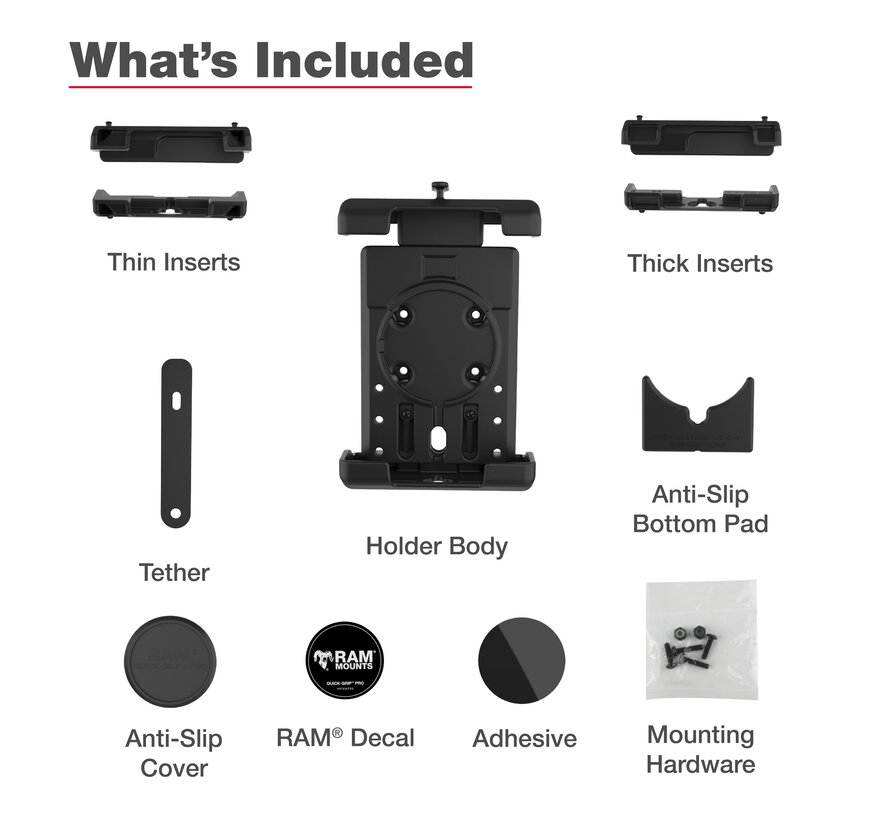 RAM raadt aan de bijgeleverde rubberen apparaatbeveiliging te installeren wanneer deze houder in een voertuig met een open cockpit wordt gebruikt. Het is belangrijk om de afmetingen van uw handheld-apparaat met zijn hoes, behuizing of huls te verifiëren bij het bepalen van de algehele grootte.