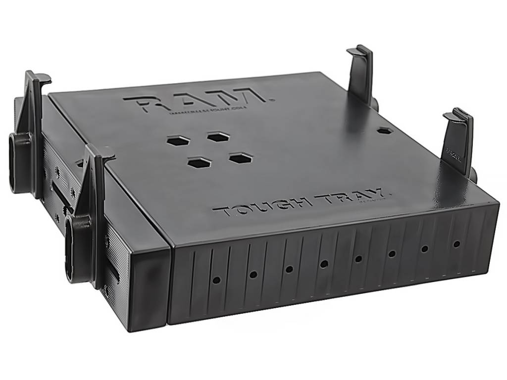 De RAM Tough-Tray™ is een uitschuifbare lade met veermechanisme die plaats biedt aan 10 tot 16 inch brede laptops. De lade bevat vier klemarmen aan de zijkant, waardoor uw laptop volledig kan worden gesloten in de lade. Deze armen kunnen zowel verticaal als horizontaal worden verplaatst, waardoor ze op maat kunnen worden gemaakt voor laptops van verschillende diktes en de vrijheid om poorten of schijven niet te blokkeren. Gatenpatronen op de omtrek van de lade vergemakkelijken de montage van extra RAM-systemen ter ondersteuning van GPS, PDA's of andere elektronica.