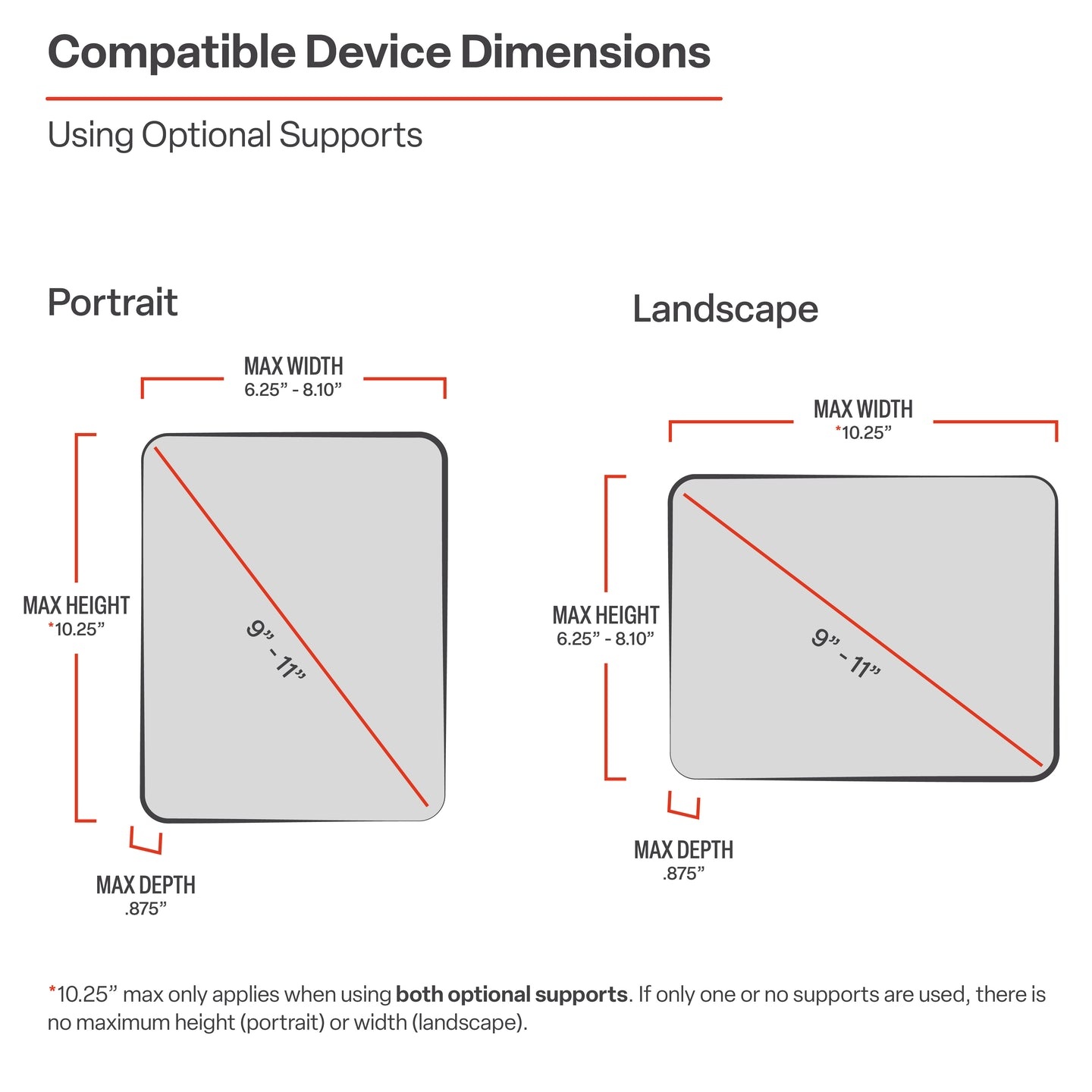 De RAM-HOL-UN9U bestaat uit een composiet veerbelaste houder, uitschuifbare grijparmen en een extra onderste steunhouder. Inclusief extra, gemakkelijk toegankelijke grijpknoppen aan de achterkant van de houder voor snelle verwijdering van uw tablet. De RAM-HOL-UN9U kan worden uitgeschoven en ingeklapt voor een perfecte pasvorm op de meeste 10" tablets met of zonder hoezen, evenals op sommige kleinere tablets. Controleer hieronder de afmetingen van uw tablet voor compatibiliteit met de X-Grip®.