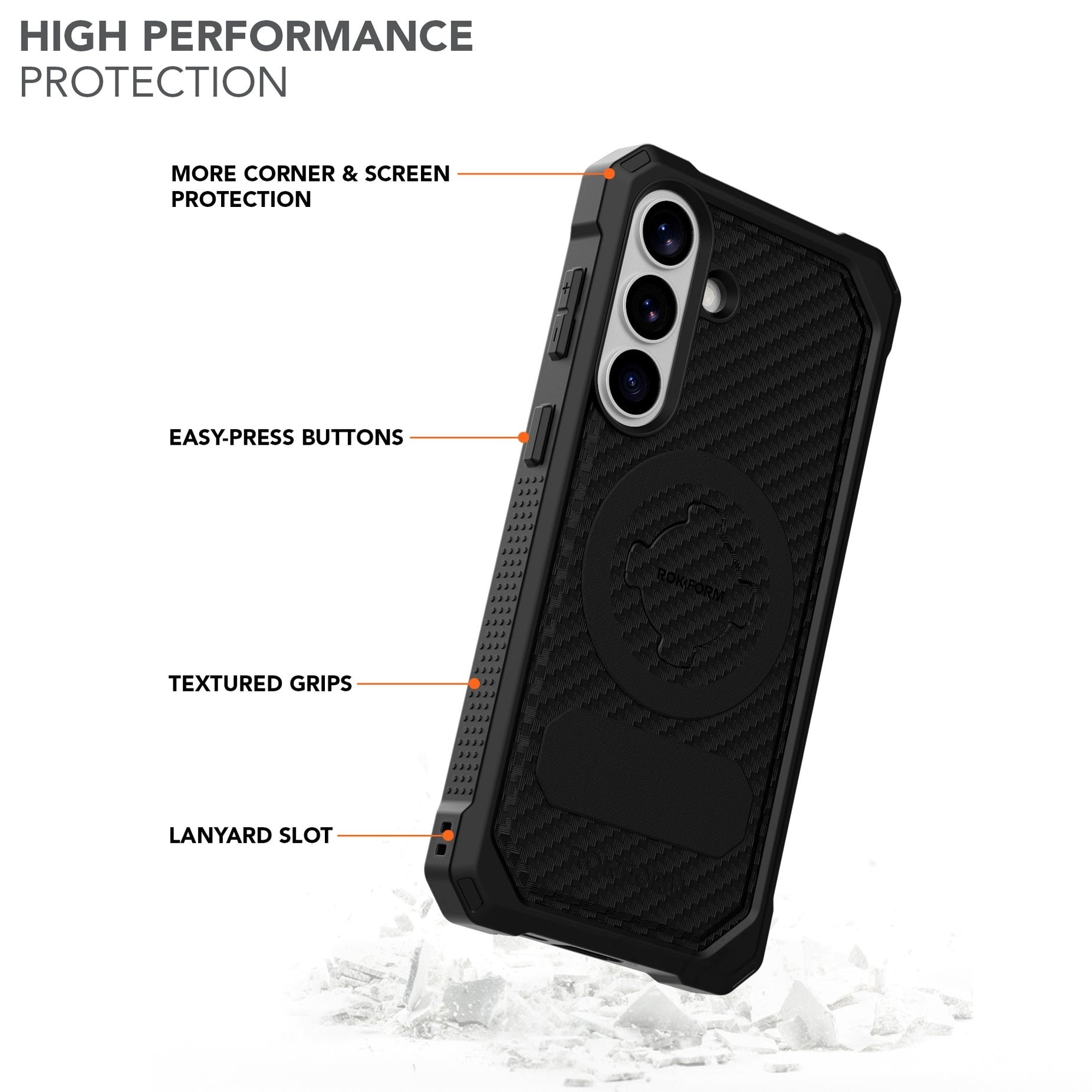 De Rokform Galaxy S26+ Rugged Case beschermt je telefoon met een combinatie van slagvast polycarbonaat en schokdempend TPU. Uw nieuwe case is slank en lichtgewicht voor gemakkelijk gebruik en dragen. Het biedt 360 graden bescherming van militaire kwaliteit die uw telefoon beschermt tegen vallen, ongeacht hoe deze landt.