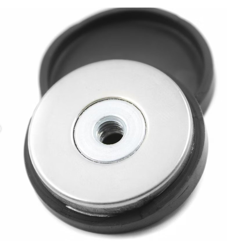 Deze neodymium magneet heeeft een metrisch M6 inwendig schroefdraad en kan aan voorwerpen met het passende uitwendig schroefdraad worden vastgeschroefd. De rubber ommanteling beschermt gevoelige oppervlakken tegen krassen en verhoogt bovendien de belastbaarheid in de afschuifrichting. Het rubber beschermt de magneet tegen sporadisch vocht en spatwater. Onder de rubber coating bevindt zich een stalen plaatje met hierop een magneet geplaatst.