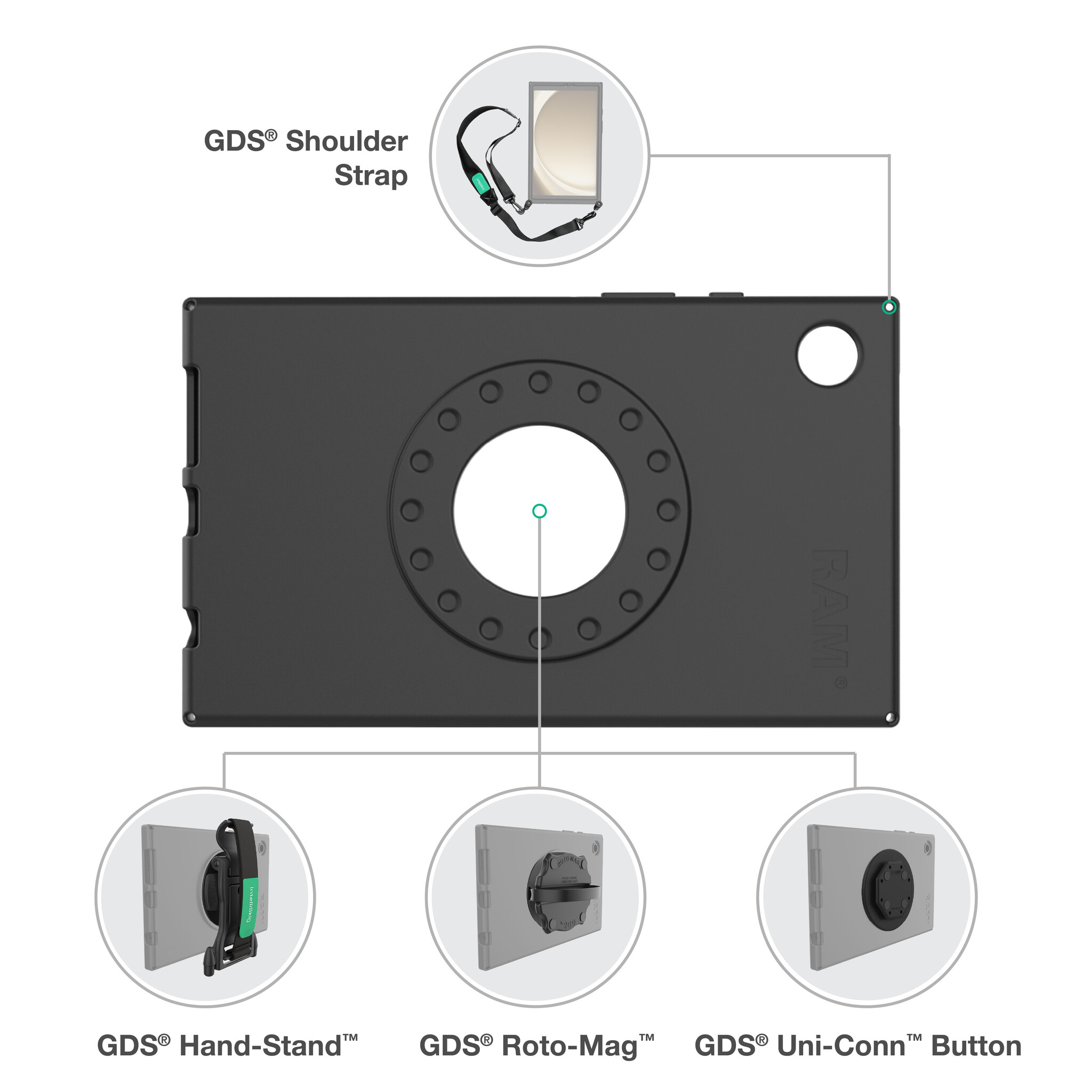 Het is een accessoire zonder stroomvoorziening en beschikt over een ergonomisch accessoire-toegangspunt in de achterkant voor accessoires zoals de GDS Uni-Conn Adapter, GDS Hand Strap, GDS Hand-Stand en de GDS Roto-Mag.