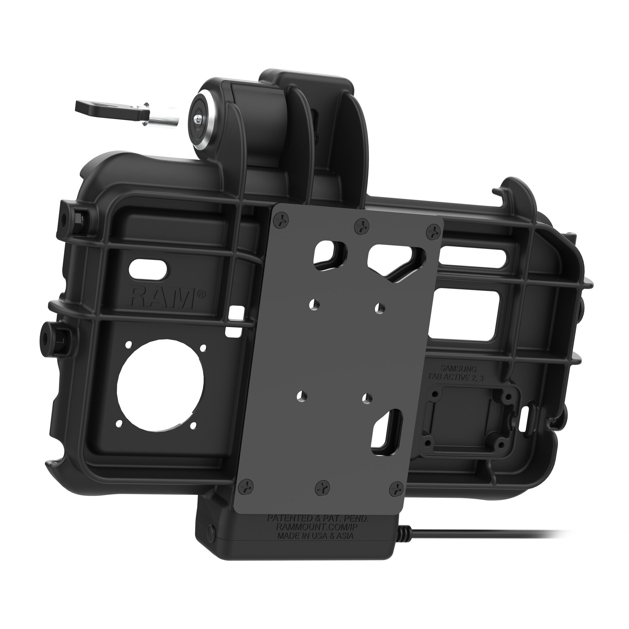 - sleutelvergrendelende, op maat gemaakt, aangedreven dock specifiek ontworpen voor de Samsung Galaxy Tab Active5 & Tab Active3 in een Samsung OEM-beschermhoes of RAM® Skin™