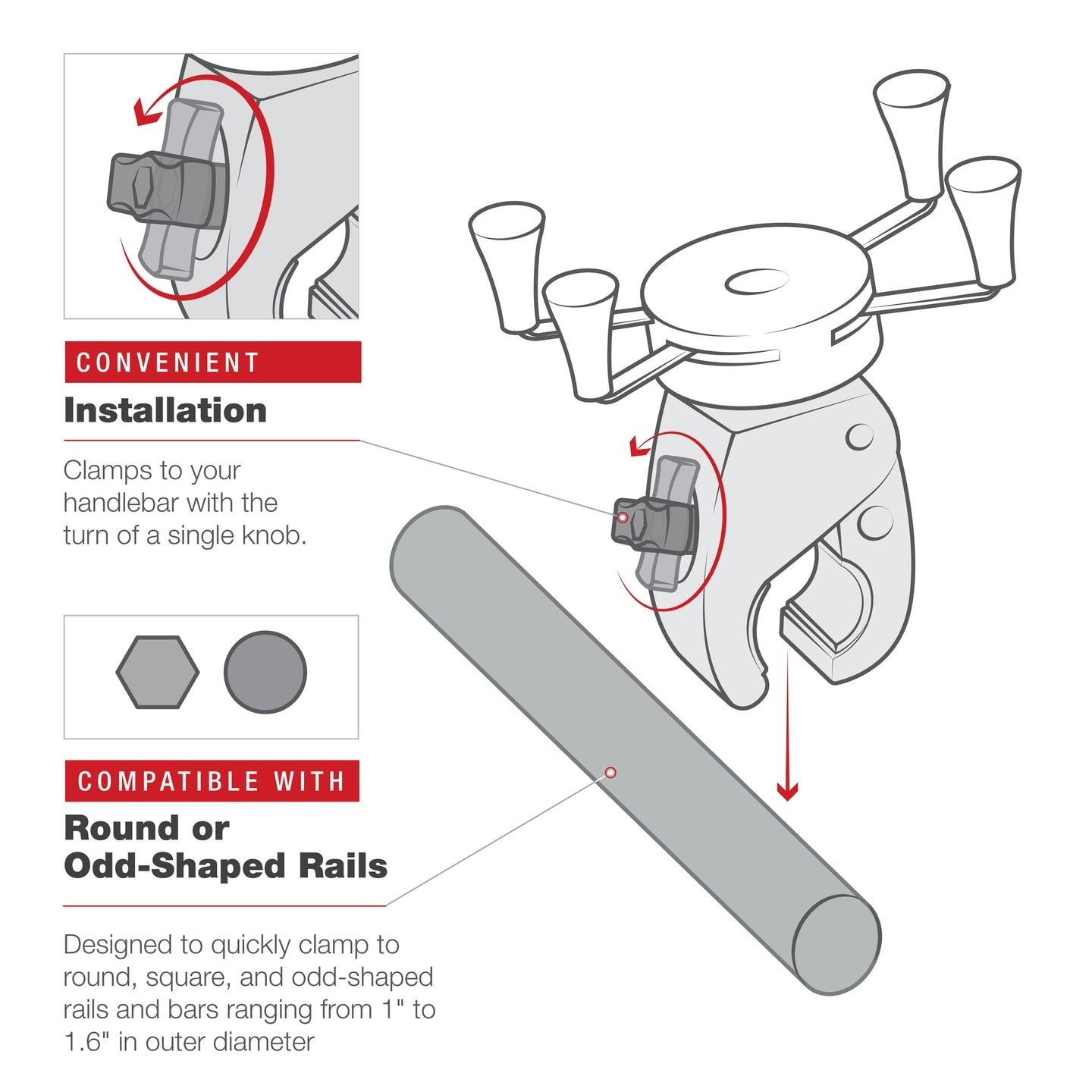 Inclusief medium versie van de RAM® Tough-Claw™ basis, ontworpen om te klemmen op ronde, vierkante en vreemd gevormde rails en staven met een buitendiameter van 2.5 tot 4.8 cm; rubberen pads zorgen voor een stabiele grip en bescherming van het montageoppervlak.